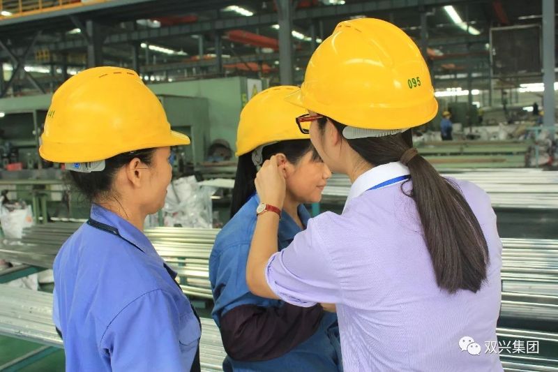 圖3:安全員現(xiàn)場講解與指導(dǎo)員工正確佩戴耳塞,安全帽等防護(hù)用具。